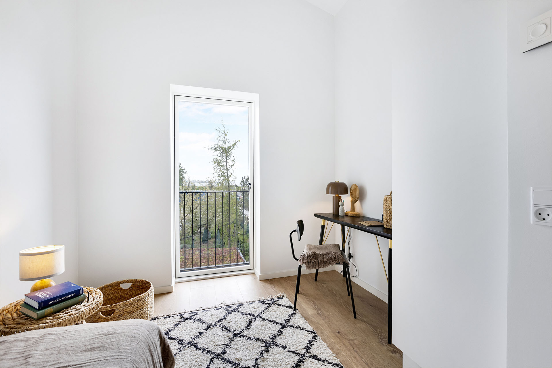 I Carolinelunden er vinduerne bevidst placeret således, at de giver større udsyn i flere retninger, og lukker dagslyset ind, så de indvendige leverum fremstår lyse og imødekommende.